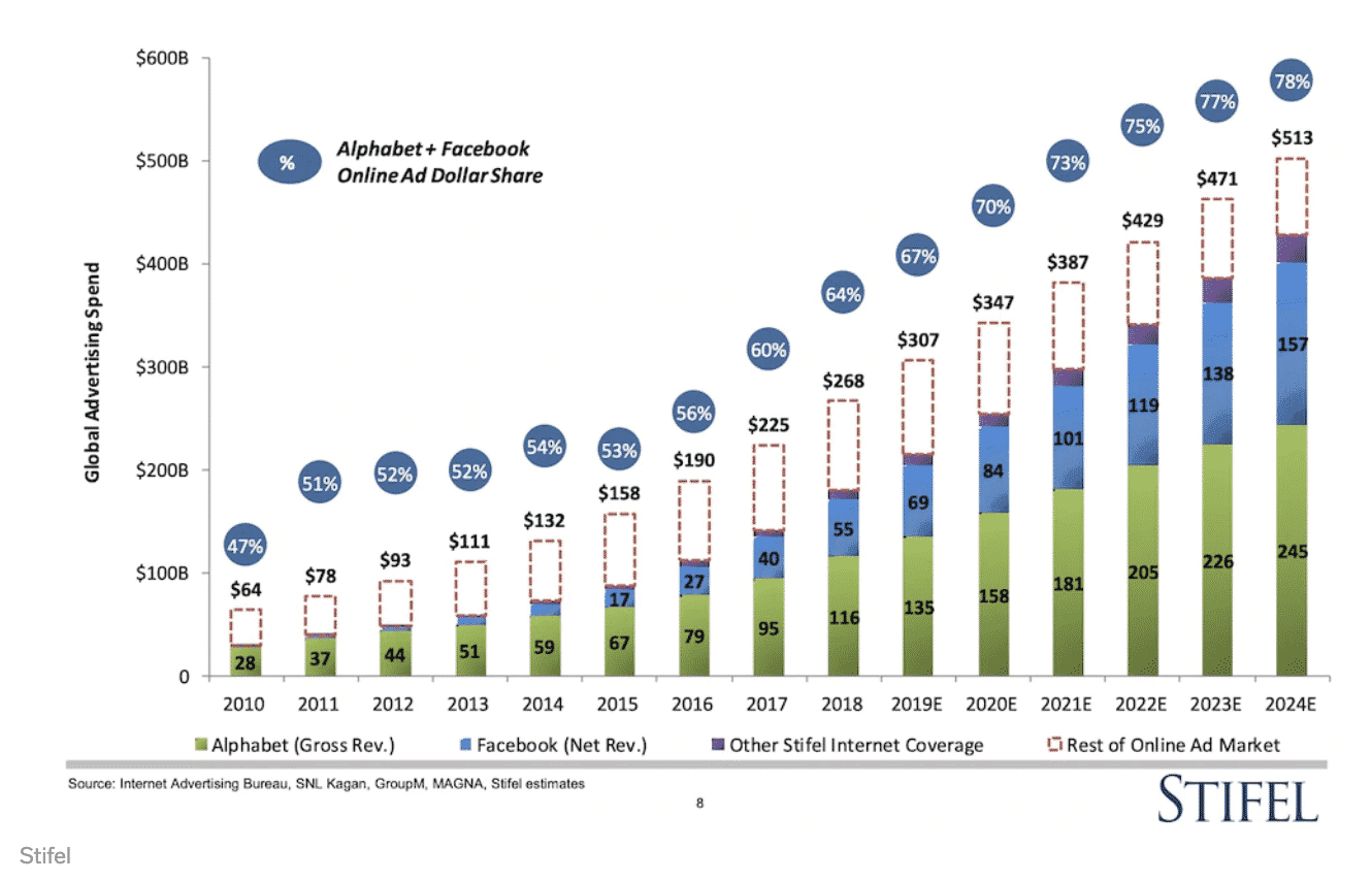 When I published the 2020 predictions for mobile marketing on Mobile Dev Memo last year, in which I anticipated the death of the CMO role for mobile-first companies, many noted that the “death of the CMO” is a decades old premonition that has never materialised. I hate to ever say that “time time is different,” but this time genuinely is different: not only have Facebook and Google completely abstracted away the mechanics of digital campaign management, but they are also capturing an increasing proportion of digital marketing growth as a result of momentum, insurmountable leads in advertising technology and data, and incumbent-preserving regulation in the form of GDPR and CCPA. These are substantive changes.