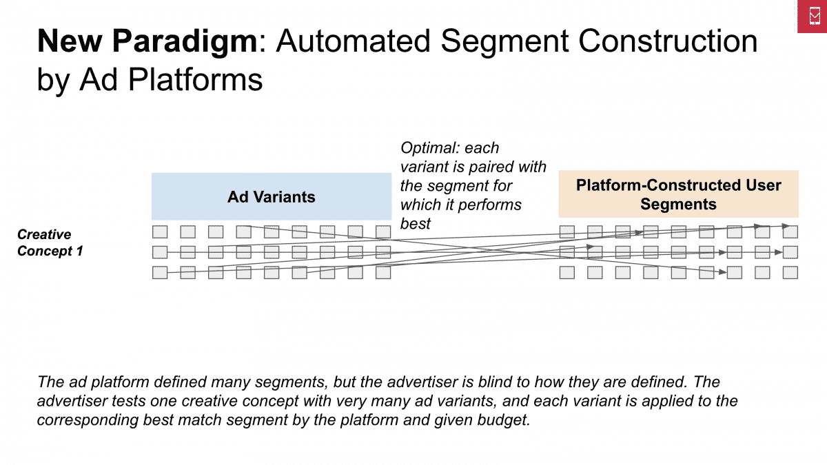 The importance of numerous and varied ad creatives in the algorithmic campaign management environment that Google and Facebook have ushered onto mobile is widely acknowledged, but less understood is the purpose of that experimentation: to allow the platforms to explore and define relevant audiences and reach them with semi-bespoke messaging (more on this topic here).