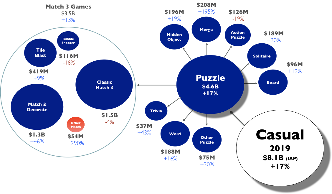 Puzzle genre is the second largest, after strategy games, on mobile in terms of in-app purchases. Last year Puzzle games generated a whopping $4.5Bn in IAP revenues while growing 18% year-on-year. The lion share of puzzle game revenues come from Match-3 games, which generated $3.4Bn in IAPs growing at a healthy pace of 13% year-over-year.