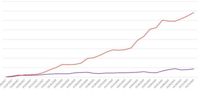 The pink graph shows Matchington Mansion starting to scale in early 2018 followed quickly by the scaling up of both Homescapes (purple) and Gardenscapes (blue). In late 2019 Matchington Mansion starts to decline rapidly, which may indicate that the battle between Playrix and AppLovin is over on this front. Though with the acquisition of Belka and PeopleFun we believe that the war between the two has only started.