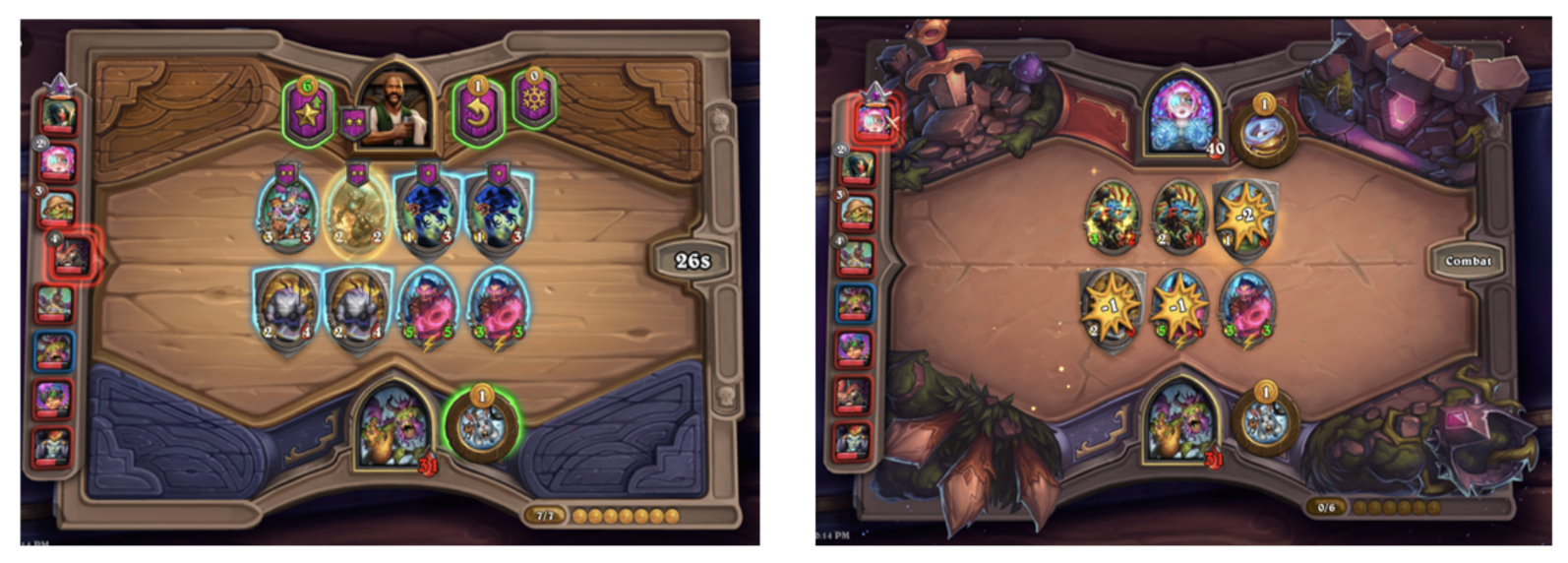 Hearthstone Battlegrounds: the “Recruitment Phase” (left) and the “Combat Phase” (right)