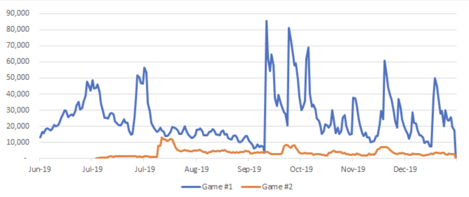 Long-term retention may also be a problem. The chart below suggests that the excitement for TFT has been fading since launch, despite a whole new set of characters was released in Nov ’19.