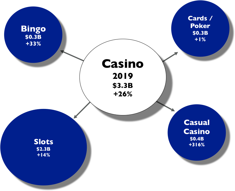 As you’ve noticed from the previous prediction post, we actively refer to the categories, genres and sub-genres. This article in our prediction series will cover the Casino category. It is made up of four sub-genres - Slots, Bingo, Poker/Cards and the newest one, what we’re calling “Casual Casino”. To understand our taxonomy in details, please read this. To understand it at a glance, please look at the image below.