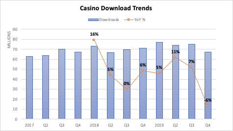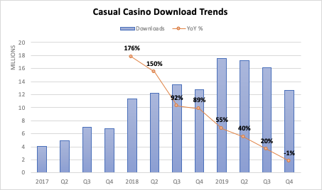 While every other genre posted double digit YoY revenue growth, Poker/Cards was clearly the runt of the litter. Poker/Cards was the least growing sub-genre of the Casino category in 2019 with only a meagre +1 % YoY growth. While the rest of the market grew at double digit rates, this can almost be interpreted as a decline. Also, given the steeply declining YoY revenue growth rate curve, absolute revenues plateauing over 2019 and downloads consistently trending downwards, the writing has been on the wall for some time now.