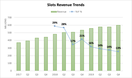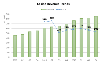 The Bingo sub-genre continued its upward streak in revenue through 2019, growing a substantial +33% YoY. Despite strong top-line numbers, the rate of revenue growth has continued its downward trend. The growth rate in Q4 2019 was nearly half that of Q4 2018. If this trend continues, annual revenue growth will be less than 10% by 2022.