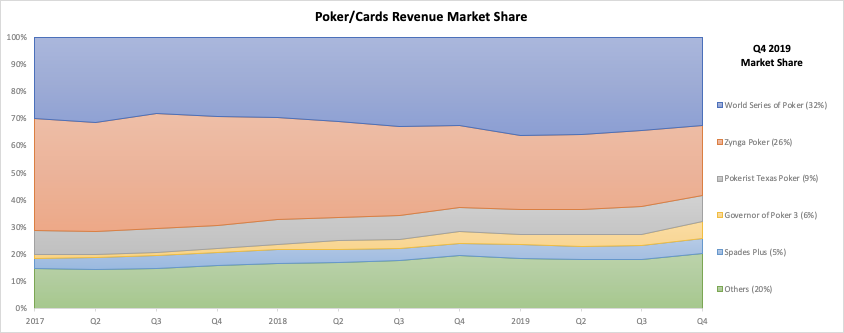 One game that has gradually stolen market share from both WSOP and Zynga Poker over 2019 is “Governor of Poker 3” from Youda Games - showcasing a strong +50% YoY revenue growth. It ended the year at a 6% revenue market share.