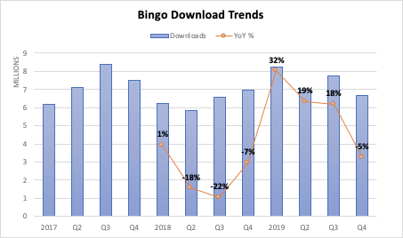 Last year, DoF predicted that the market would “continue to stay stable through 2019 with all key players holding their market positions”. It is safe to say that these predictions proved accurate: Both revenue and downloads continued to increase, and the five highest-grossing Bingo apps maintained their positions despite some market share movement.