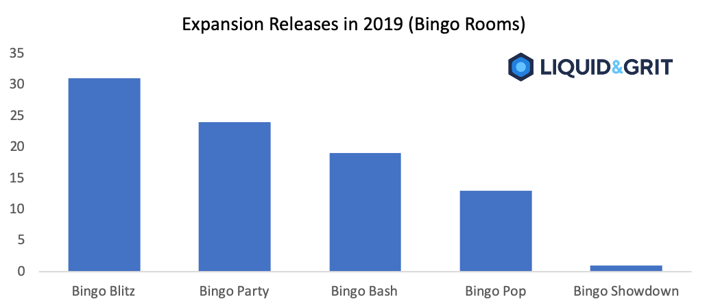 Another component of Bingo Blitz’s success was its team’s output. Bingo Blitz released the most new bingo room content of all top-grossing Bingo apps.
