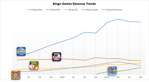 Bingo Blitz strengthened its grasp on the market in 2019, accounting for 49% of the sub-genre’s revenue—up from 47% in 2018 and 44% in 2017. This growth in Bingo Blitz’s market share came primarily at the expense of Bingo Bash, which fell from 19% in 2018 to 14% in 2019. So probably expected.