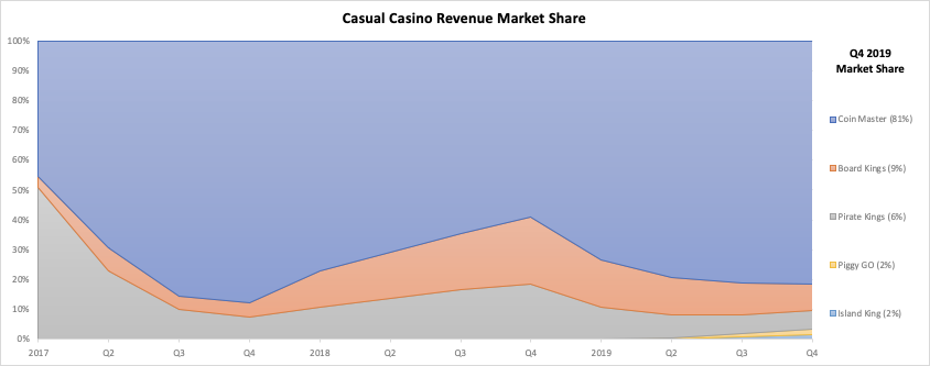 Looking at the Coin Master’s success, the clones naturally started to pour in. Even though Coin Master was not the first to market, it was definitely the best to market. And none have been able to steal market share from it. Though notably, Piggy Go is one game that managed to get its foot in the door, ending the the year with a 2% market share and continued growth. Probably because it is a Coin Master meets Board Kings mashup - the two market leading apps in Casual Casino. And it is quite a polished product at that.