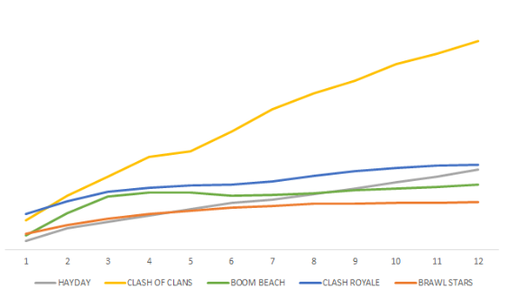 Revenue per Install of Supercell games in their first 12 months after launch (source: Sensor Tower)