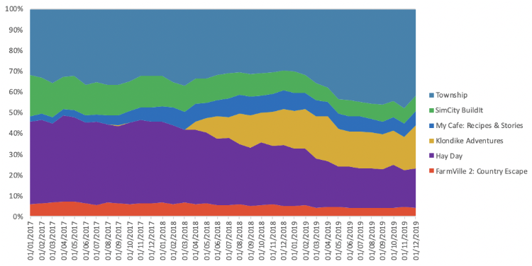 Despite being the highest grossing farming game for a long time, Hay Day has been gradually losing market share in the last 2-3 years. In particular, Hay Day’s revenues started to decline in 2018 when Klondike’s Adventures (from Playrix’s Vizor) was released. The decline continued in 2019 when Playrix’s Township, after having been neck and neck with Hay Day for years, started to scale up UA leading to a situation where Township is twice as big as Hay Day.
