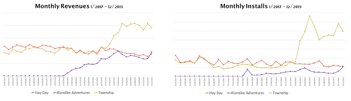 Township, Klondike, and Hay Day: Revenues and Installs over 2017-2019 (source: Sensor Tower)