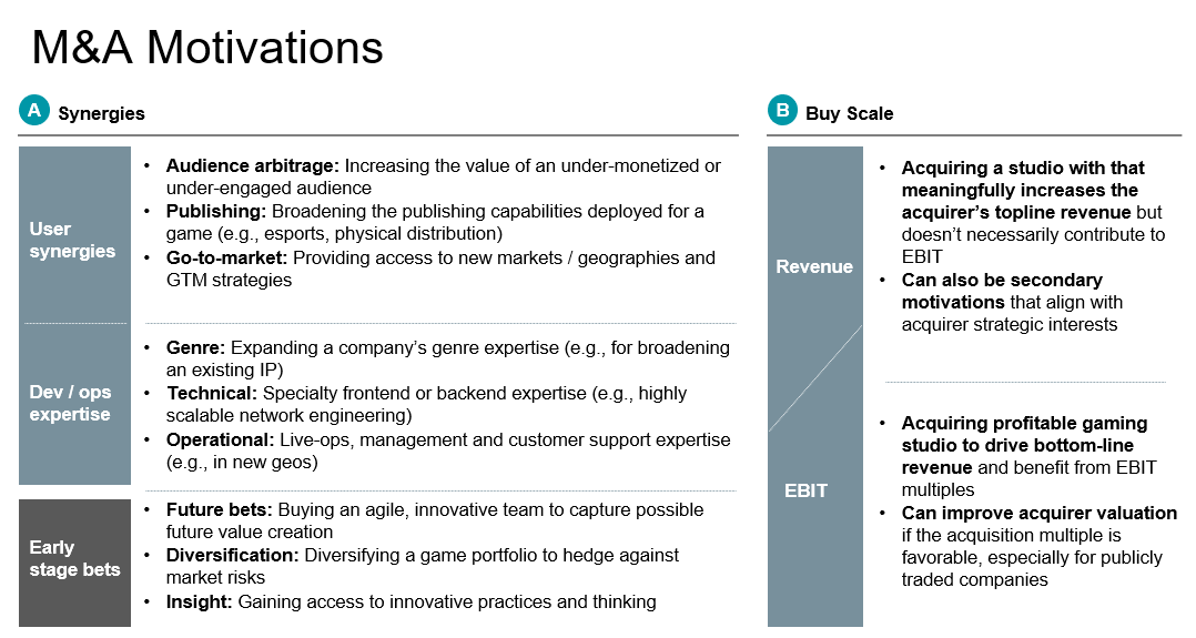 In general, M&A strategies are built around acquisition of synergies and purchasing of scale. The two are often supported with smaller investments into future bets.