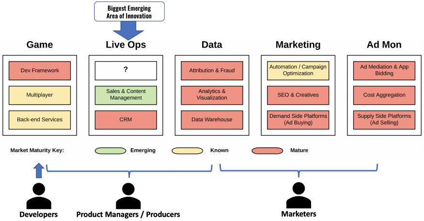 The diagram above depicts a simplified industry framework to conceptualize the key categories of games infrastructure services providers. Further, we include 1. the stage of maturity of each sub-category and 2. the game studio functional roles that typically utilize those service providers.