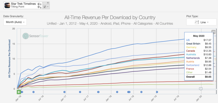 Even further, they achieved — approximated by Sensor Tower for mobile — $17.57 in revenue per download (RPD also called ARPI) in the US and $9.65 revenue per download on a worldwide blended basis.