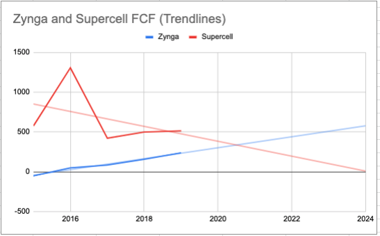Based on simple trend lines, we would expect Zynga to overtake Supercell in FCF generation in the next few years. Below is the graph of historical (2015–2019) and projected (2020–2024) free cash flow of both Zynga and Supercell by linear extrapolation (not necessarily our belief of what will happen) for the two companies. Note: Supercell FCF is estimated (Note 1 below).