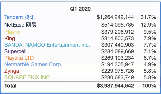 Above, I show the Q1 2020 market share for the top 10 2019 mobile game publishers according to Sensor Tower.