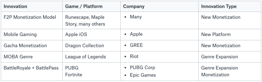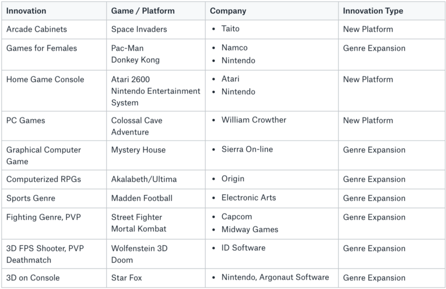 Genre Expansion: Most of the innovations seem to have come from a new game genre hitting the market and expanding the available player base