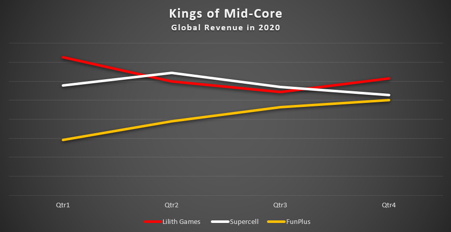 Looking at global revenues, Supercell and Lilith both declined during the frothy 2020 while FunPlus made incredible gains.