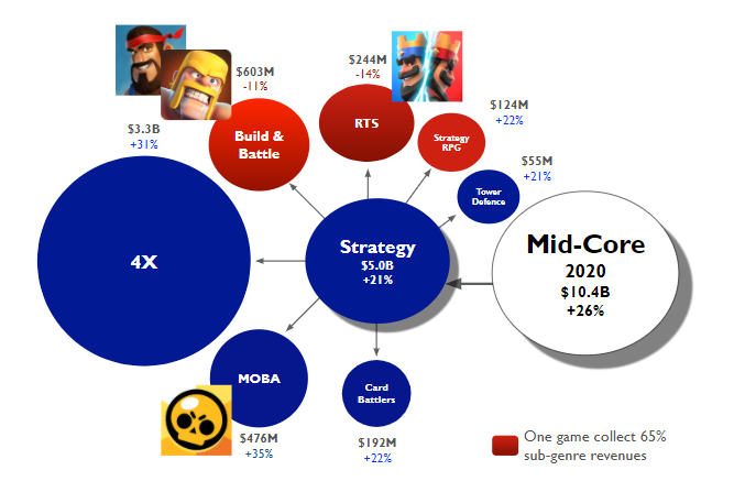 Strategy games, which are composed out of 7 sub-genres, generated $5B in net revenue during 2020 growing IAP revenues by 21% while the downloads were up 9% year-over-year. This makes the genre second largest on mobile in (outside key Asian markets) after Puzzle games. Strategy games also represent nearly a half of all Mid-Core revenues.