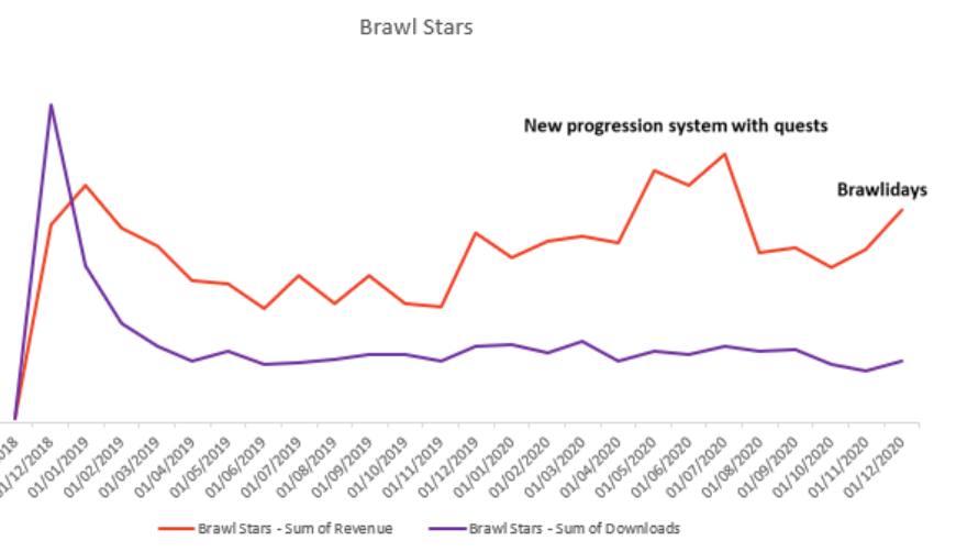 Brawl Stars’ revenues (excluding China, Japan, and Korea) show the impact of updates and also how infrequent these impactful updates are. Supercell’s Achilles’ heel is to keep up with what is expected from a modern top-grossing game. Imagine updates like Brawlidays rolling at monthly if not bi-monthly schedule instead once in 6 months like they do now…