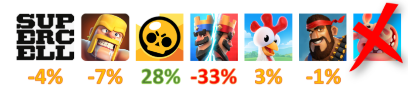 Supercell continues to control three of the Strategy sub-genres. Clash of Clans takes nearly 70% of all Build & Battle revenues. Clash Royale clears 72% of all RTS (real-time strategy) revenues and Brawl Stars takes an honorable 60% of all MOBA incomes. Over the years, Supercell’s portfolio has become slightly more balanced, with other games than the Clashes bringing in a more significant portion of the revenue. Yet while Supercell’s dominance in the three subgenres is largely unquestionable and remains unchallengeable, there are some concerns that can’t go without mentioning.