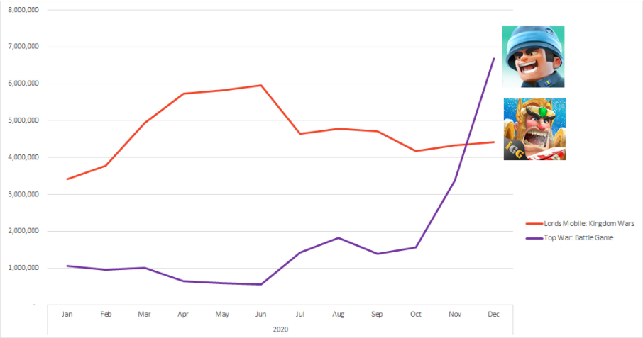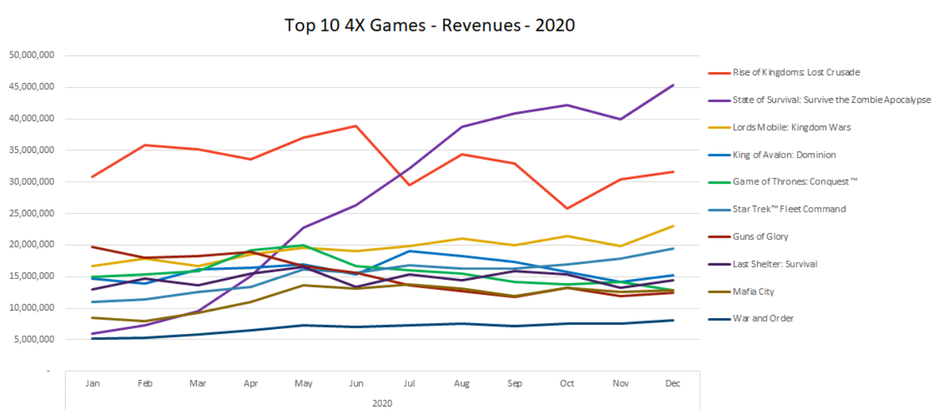 FunPlus’ State of Survival was the monster hit of 2020. Lords Mobile from IGG and Star Trek from Scopely experienced some nice growth. Liliths’ Rise of Kingdoms seems to have hit it’s ceiling in the West. Though what is not shown is the global appeal of Rise of Kingdoms as the game cleared 300M in net revenue from key Asian markets that are excluded from the graph making it by far the biggest 4X game in the world.