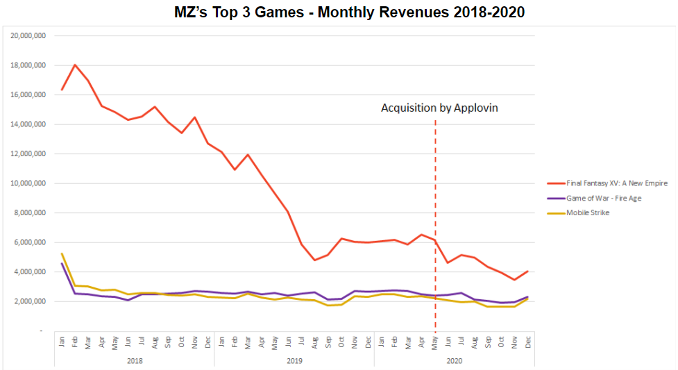 But while Machine Zone’s new games failed to scale, its legacy portfolio continued to bolster strong long tail revenues. Both Game of War and Mobile Strike steadily made around $5M monthly revenues for the past 3 years with seemingly no marketing support. So despite being considered a ‘failing publisher’ MZ managed to generate $138M in net revenues in 2020 with only 2 million new installs. Today MZ’s portfolio makes up a significant portion of Applovin’s IAP revenue every month after the acquisition.