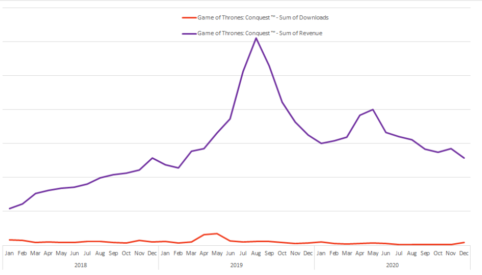 Warner Bros had a steep decline in both revenues and downloads (16% and 64% respectively) but still managed to generate $190M thanks to the strong long-tail performance from Game of Thrones: Conquest. The company announced a collaboration with NetEase for the development of a new strategy game based on The Lord of the Rings IP. Which seems like the WB is taking a step backward since they already did a Hobbit game with Kabam back when Kabam was the premier 4X publisher in the West.