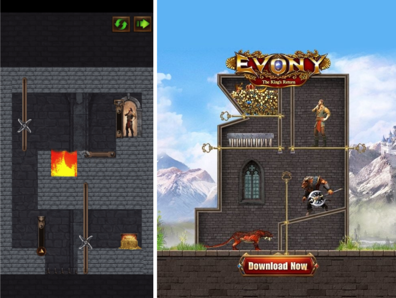 The second title to mention is “Evony” which was originally launched in 2016. Its publisher Top Games tried to scale up the game several times in the last 4 years (including a Super Bowl ad in 2017) but never managed to secure a stable position in Top 20. But in March 2020, Evony followed up Playrix’s marketing strategy by creating marketing copies around “solving puzzles and saving heroes” and implemented a puzzle oriented gameplay.