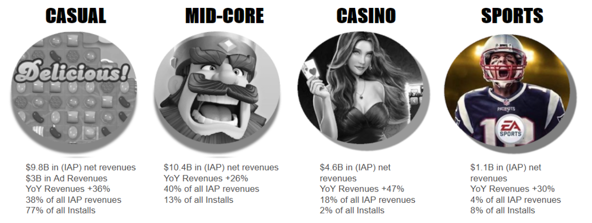 The racing category is characterized by a disparity between the revenue share and the install share. A negative one. For example, Casino games accounted for 2% of total installs, but a whopping 18% of all IAP revenues. In the case of Racing, we’re looking at 4.6% of installs and 1% only one percent of all revenue.