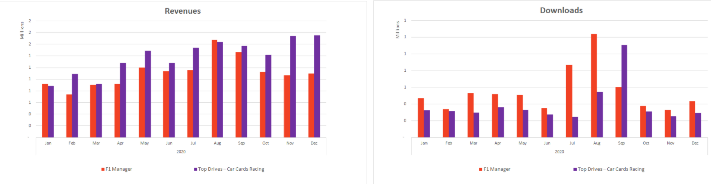 In 2020, the whole realistic racing sub-genre, comprised of games with real brand cars and core gameplay of driving, grossed ~$200M while attracting an amazing ~1.1B of downloads. The sub-genre saw a 35% increase in downloads followed by a 27% increase in revenues and as we said it was the driver of growth for the whole Racing category. The growth can be categorized into two groups of games:
