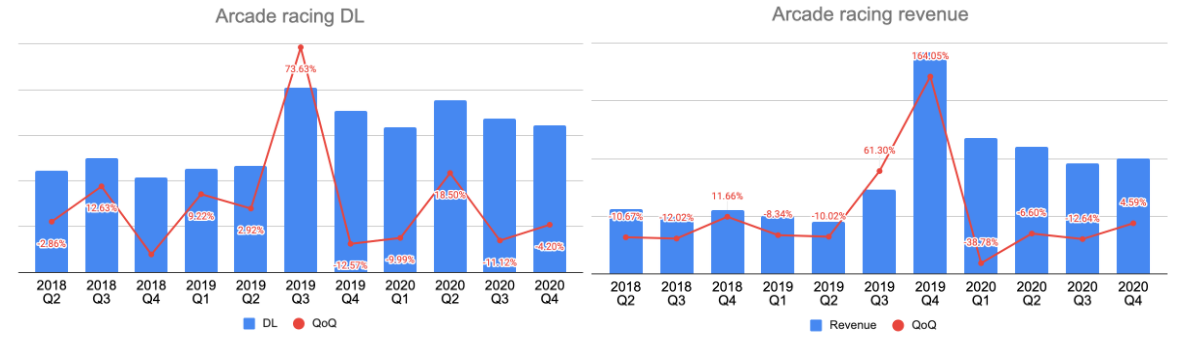 In 2020, Racing revenue has increased by 24% while downloads in the category grew by 25% compared to 2019. If we dig deeper into QoQ, it’s evident that most of the growth for 2020, both in downloads and revenue, came from the first wave of lockdowns in Q2 of 2020. After Q2 the downloads and revenues in the category declined a bit but continued on a significantly higher level compared to 2019.