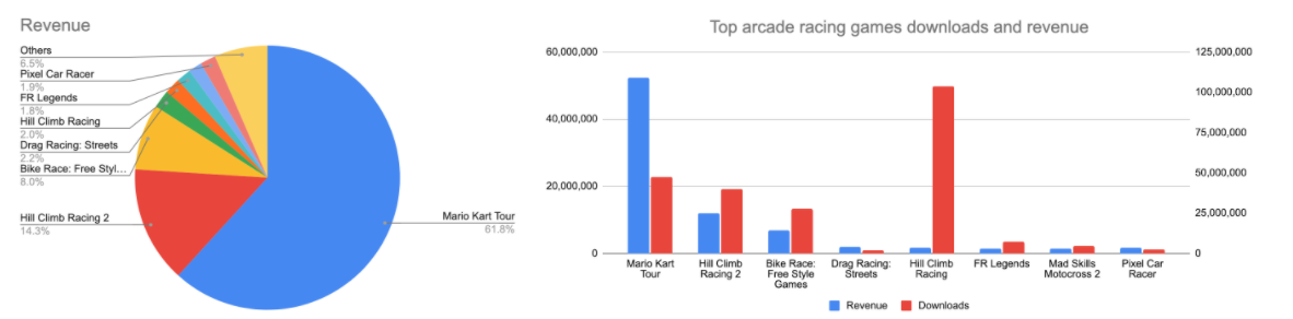 Arcade games have their emphasis on the gameplay and skill-component overpower progression. The retention of these games is tightly tied to how addicting the core driving experience is. And it’s because of the freedom arcade can allow for. In an arcade you can bend reality to fit fun gameplay, e.g. doing insane and unrealistic jumps or football moves. But while bending reality can be really different for different sports and gameplays, it seems to be less fruitful for racing games. Generally speaking, in racing, you can be accelerating, steering, bumping into others, and sometimes shifting gears as well as braking and drifting. In order to stand out, it feels like any breakthrough in the sub-genre would have to involve some significant creative innovation in gameplay and/or in the marketing of the game. And while Mario Kart Tour has generated well over $100M inside the first year and continues to generate several million a month, this can be largely attributed to the 100M installs the IP has attracted. The same game with a different IP would arguably have made one-tenth of the revenue.