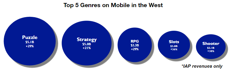 Puzzle, out of all of the genres and mobile, is the largest one when looking at IAPs only. It made $5.1 billion in 2020, growing 29% compared to 2019. In casual games overall, puzzle games account for just over 50% of all revenue for 2020.