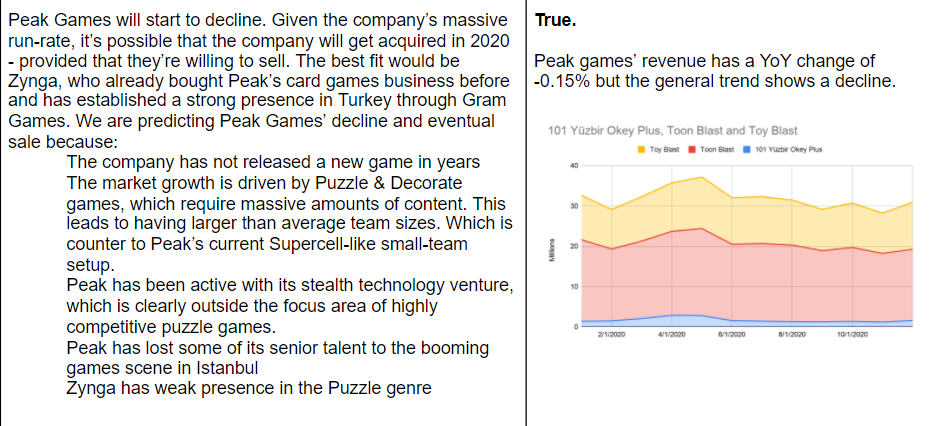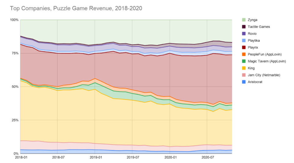 Zynga started as the champion of simulations games, but has somehow become the puzzle underdog, growing by acquisitions to tackle even larger foes. However, every acquisition usually provokes a few to leave and while Zynga may be backfilling roles in Turkey, the magic that made Peak great might instead be found in Istanbul's burgeoning game startup scene (Dream Games’ Royal Match is one to watch in 2021). Zynga’s acquisition strategy suggests a desire for highly diversified revenue and a pipeline to ensure new games launch as old ones retire. It is unlikely they will unseat King or Playrix, next year or in years to come, but again, it doesn’t seem to be the goal.