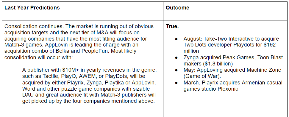 2021 will be the year of acquisitions’ soft launches specifically from Zynga (Peak) and Playrix (Zagrava, Plexonic) in H2 2021. By the end of 2021, companies that were acquired in 2019, and early 2020, will have had roughly 2 years of runway to release a game. We think there will be at least 1 new puzzle game from either Playrix or Zynga that’s a product of their acquisitions.