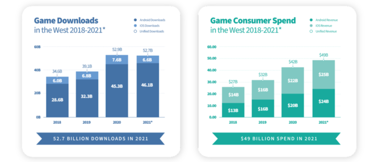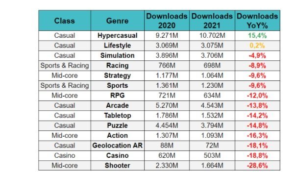 When it comes to downloads, casual games were downloaded 33 Billion times, which despite the astonishing number is just a tad less than a year ago. The downloads for the mobile games market declined 5%. And to be even more accurate, Hypercasual games was the only genre that continued to grow in terms of downloads last year.