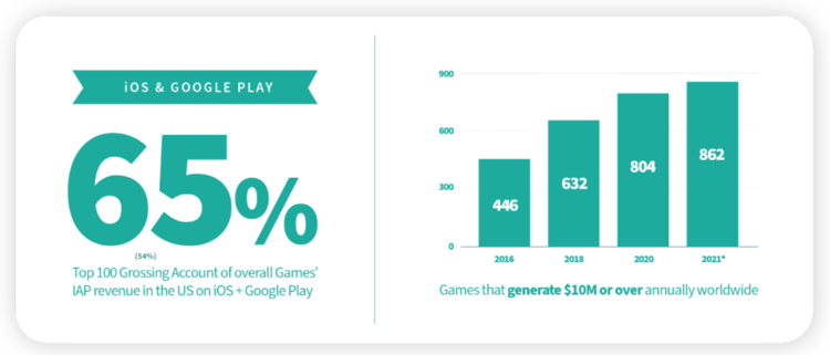 The market became more top-heavy in 2021 with 65% of all in-app purchase revenue going to the games in the top 100. At the same time, last year's games that crossed $10M in net revenue continued to grow.