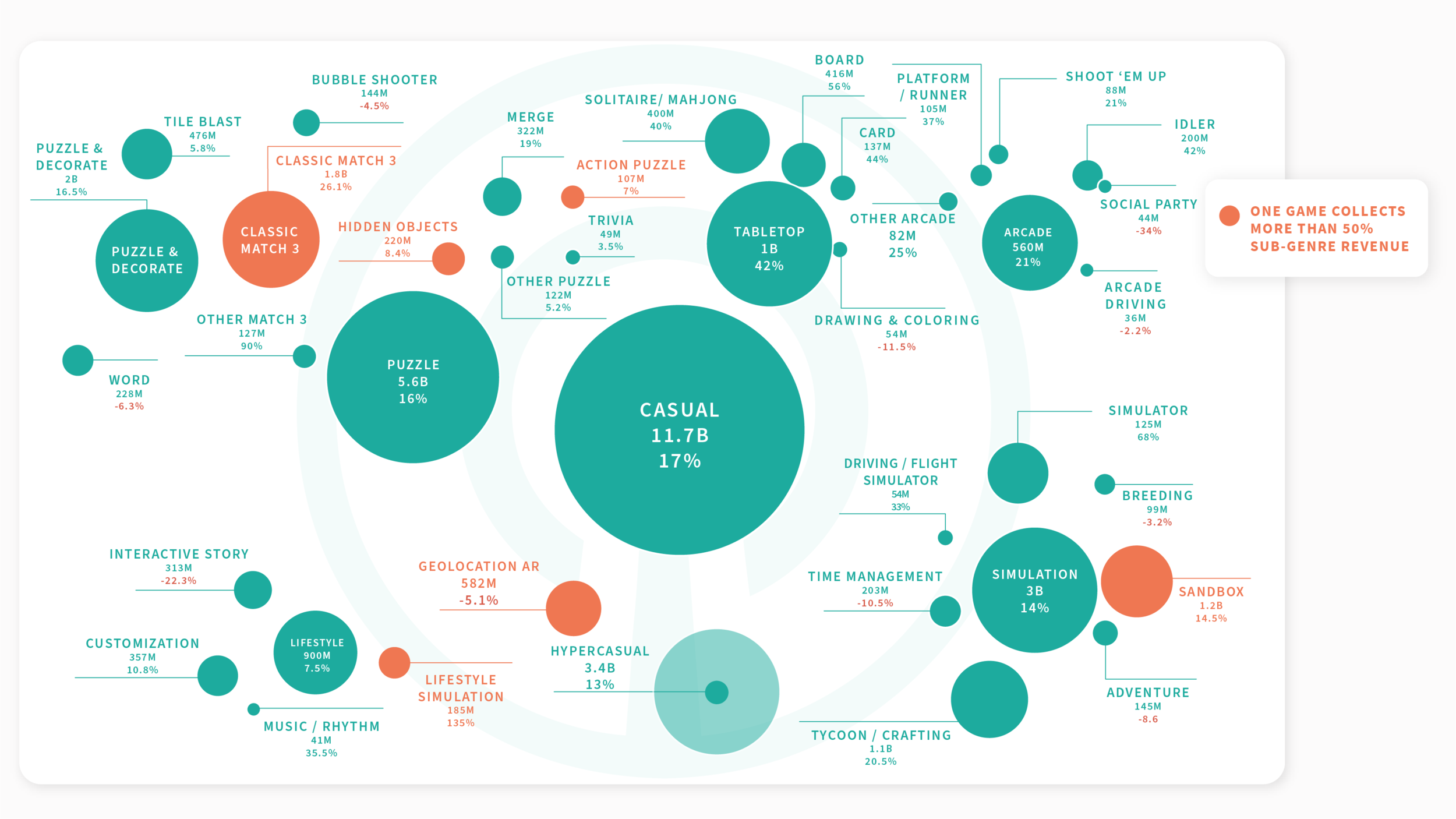 In our taxonomy, built together with Sensor Tower, the casual games category is divided into seven genres: Puzzle, Hypercasual, Arcade, Tabletop, Simulation, Lifestyle, and Geolocation. These genres are then further divided into sub-genres allowing you to compare similar games (in terms of features and to some extent audience) to one another.