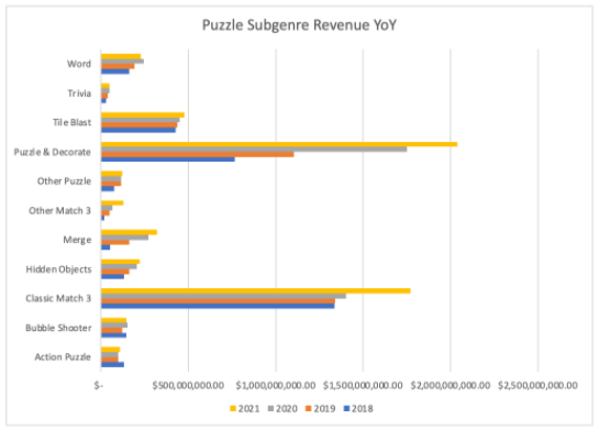 The lifestyle changes of 2020 saw an increase in people becoming players and downloading games to likely pass the time at home. We saw a 30% increase in downloads from 2019 to 2020 and a similar increase in revenue over the same timeframe. This year, mostly due to the consequences of the changes to IDFA, but potentially to a lesser degree due to the small bouts of freedom from restrictions and a pent up desire to travel/adventure/leave the house from the year prior, we saw installs shrink by about 15% YoY. Revenue, on the other hand, still grew YoY, just not as much as the year prior (17% vs almost 30%). There are less new players but Puzzle is monetizing them better, some games and publishers more than others.