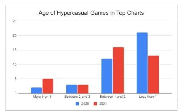 Nevertheless, when we look at how the market shaped up during the last year, it seems that those publishers and developers who were in the party early started dominating others who joined it relatively late. Out of the 100 games that were downloaded the most throughout the year, 38 games fell under the classification of Hypercasual in 2020 while this number stayed almost the same with 37 in 2021. Although this might tell us that nothing really changed, the age of those games tells the story of Hyper Consolidation of Hypercasual.