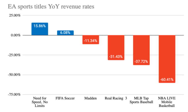 Hit: All franchise sports-based games (NBA, MLB, FIFA, Madden) except T2’s NBA stagnated or straight up declined in both revenues and downloads.