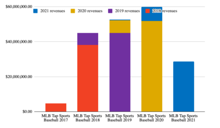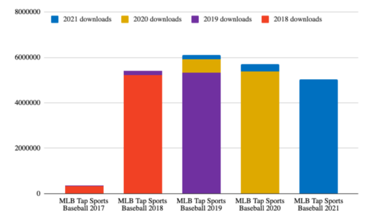 Glu’s Tap Sports Baseball game releases annually and replaces the old version quite well. This is different from EA Sport’s strategy on mobile where the game gets reset with each seasons removing the risk of migrating players to another app.Up until 2021, every new game broke the previous revenue record while keeping the similar amount of downloads year over year.