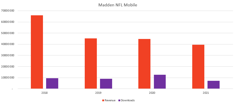 In 2020 EA launched a new Madden Mobile game to replace the existing one. This resulted in growt of installs but it didn’t stop the decline of the title in 2021.