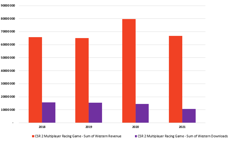 CSR2 by Zynga is in its own league when it comes to racing games on mobile. In 2020, the forever franchise broke all the records. 2021 on the other hand was a return back to normal. Downloads decreased 27% YoY, while direct revenues shrank 16%.