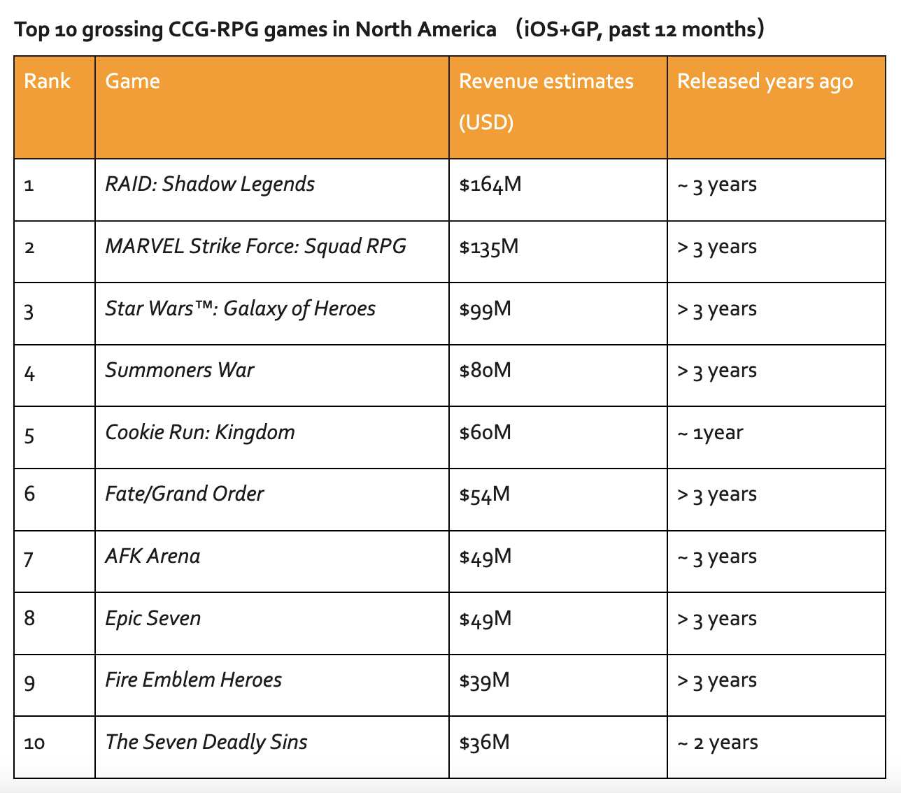 The CCG-RPG game market is saturated at the moment: while the winner takes all, new games’ chances of breaking into the top charts is incredibly slim. If we take a look at the top 10 grossing in North America, Dislyte’s target market, we find only three types of games: