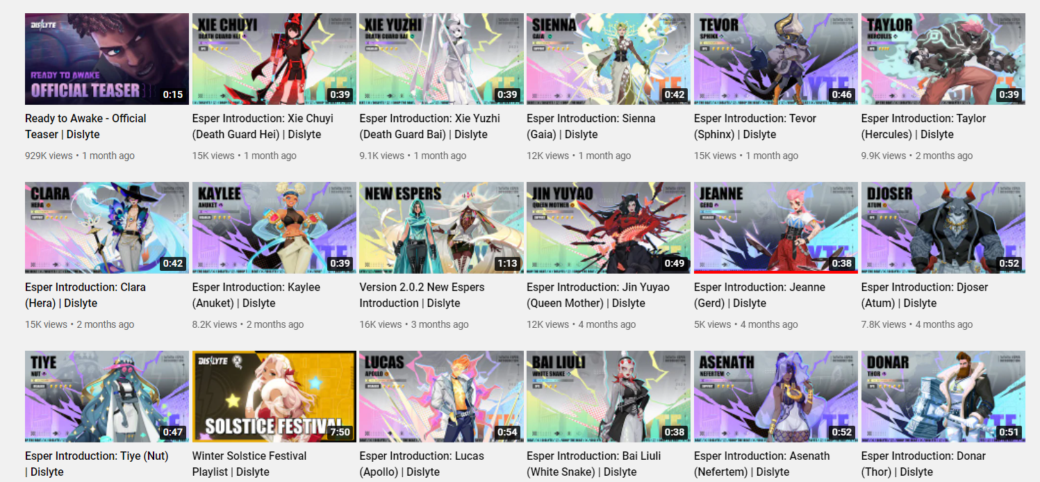 With YouTube and social media platforms as their primary marketing channels, Dislyte’s marketing campaigns were consistent and well-timed, featuring a lot of high-quality video content and fan events. Since the first announcement trailer in September 2021, the Dislyte team spent months producing multiple video series, from Video series Voice of Gyrate after the announcement, to the regularly updated character series Esper Introduction, to the behind-the-scenes series Meet the Team after launch.