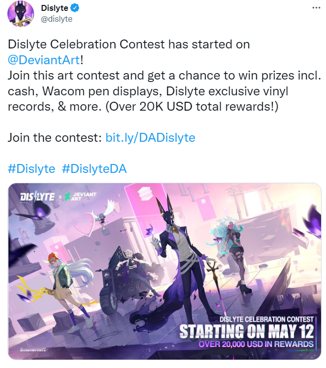 On social media, Dislyte has hosted a series of fan activities (e.g. fan art competitions, music festivals) centered around its core marketing strength—its stylized art and music. Primarily used to post holiday messaging, activity updates, and new user guide, Dislyte’s Twitter account has expanded to run a series of fan art activities in partnership with KOLs and fan art platforms, such as Meme Spree, Easter Egg Painting on Discord, and the Dislyte Celebration Contest on DeviantArt. The Twitter account has also retweeted a lot of fan art to increase engagement and recognition.
